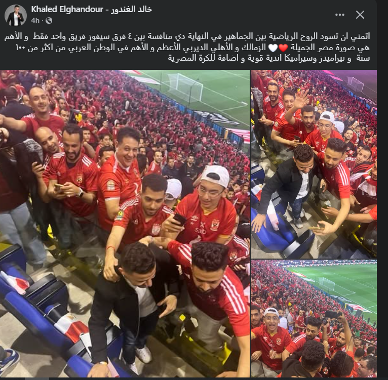 تحيا مصر، وكتب خالد الغندور عبر حسابه الرسمي”فيس بوك”: أتمني أن تسود الروح الرياضية بين الجماهير في النهاية دي منافسة بين ٤ فرق سيفوز فريق واحد فقط”.