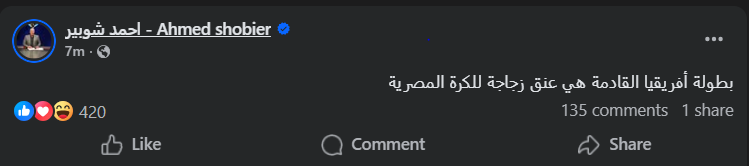 تحيا مصر، وكتب أحمد شوبير عبر حسابه الرسمي”فيس بوك”: بطولة أفريقيا القادمة هي عنق زجاجة للكرة المصرية”.