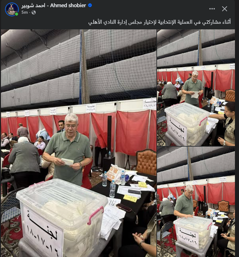 تحيا مصر، ونشر أحمد شوبير صور له داخل النادي الأهلي، وهو يدلي بصوته لقائمة محمود الخطيب، معلقاً:” أثناء مشاركتي في العملية الإنتخابية لإختيار مجلس إدارة النادي الأهلي”.
