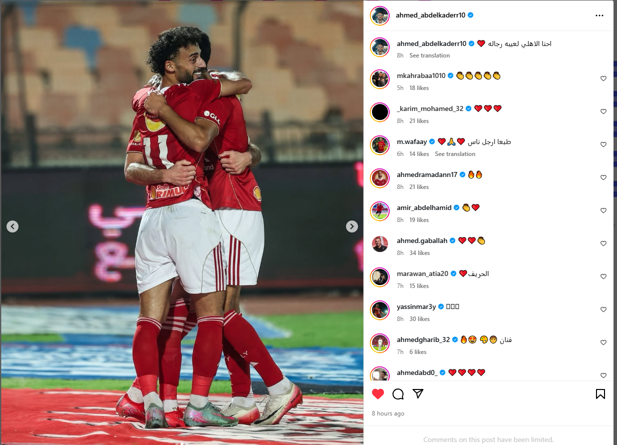 تحيا مصر، وكتب أحمد عبد القادر عبر حسابه الرسمي”انستجرام”: احنا الأهلي لعيبة رجالة”.