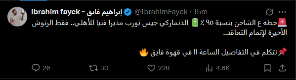 وكتب إبراهيم فايق عبر إكس، الدنماركي جيس ثورب مديرا فنيا للأهلي، فقط الرتوش الأخيرة لاتمام التعاقد.