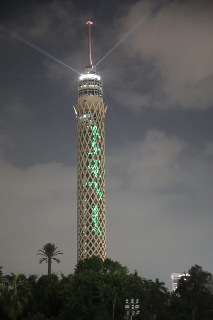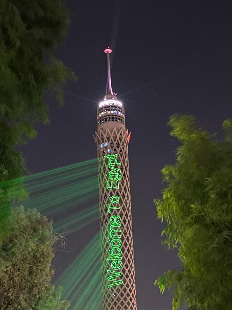 إضاءة برج القاهرة بعبارات ترحيبية احتفالا بافتتاح المتحف المصرى الكبير.. صور