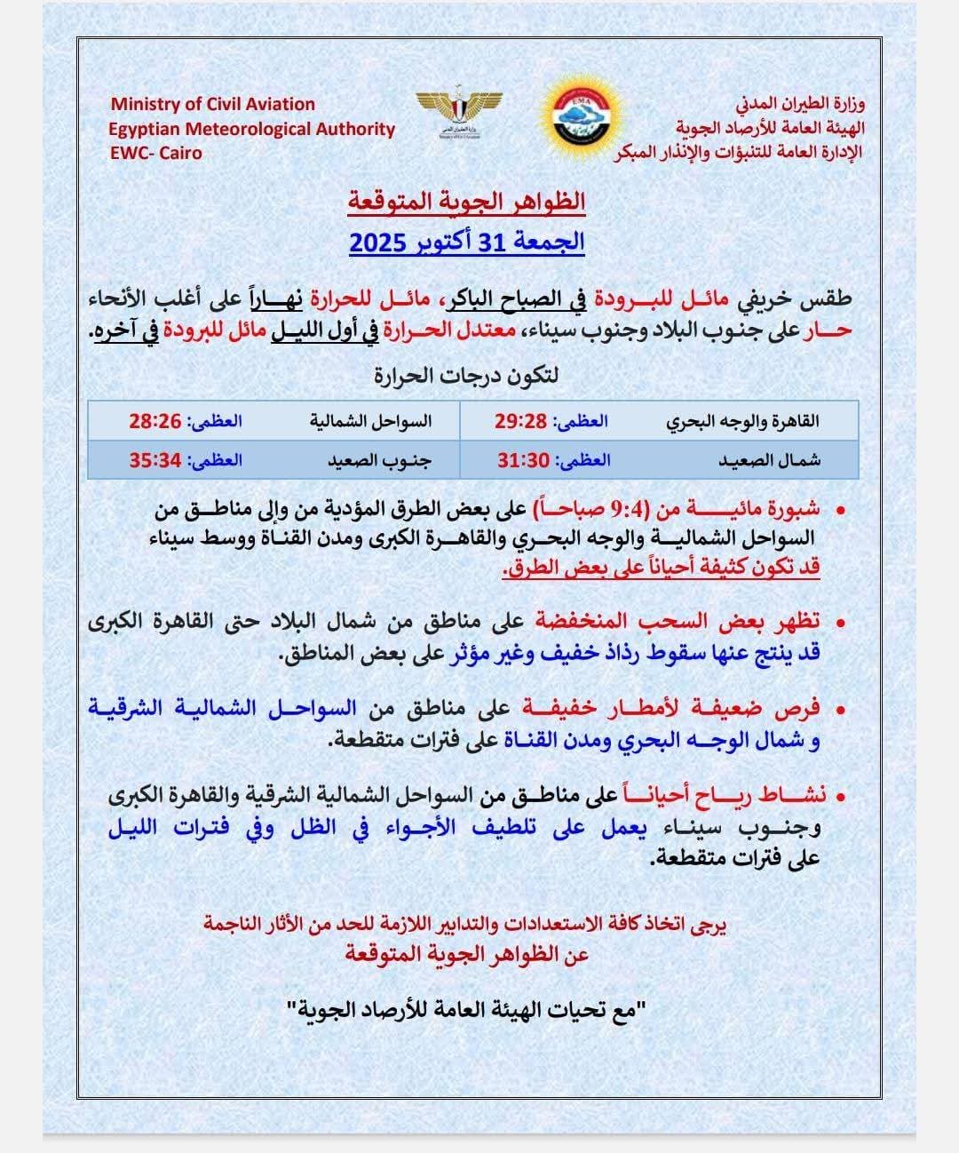كشفت الهيئة العامة للأرصاد الجوية، عن توقعاتها لحالة الطقس على القاهرة الكبرى والمحافظات، غدا الجمعة  31  أكتوبر 2025.