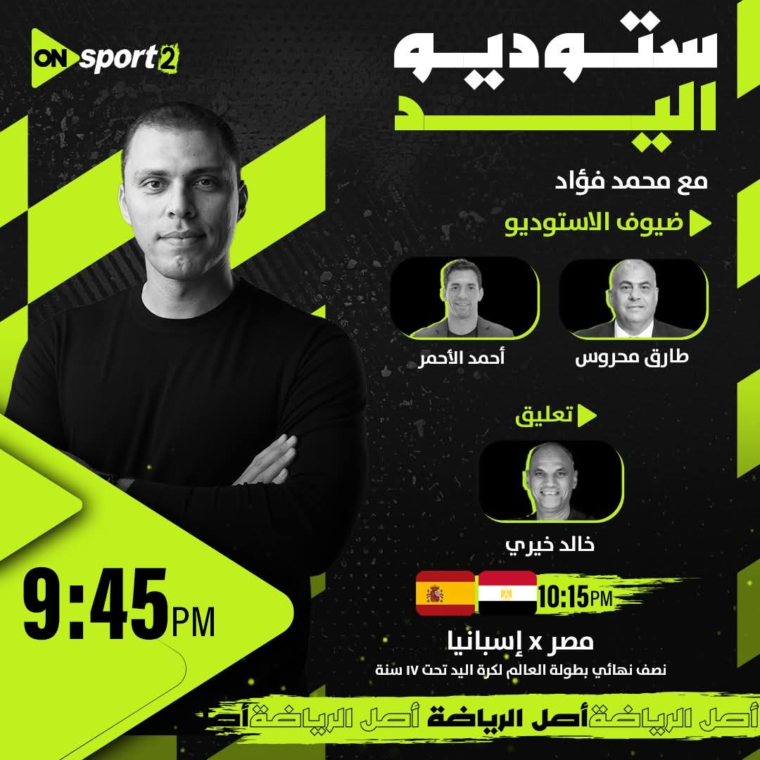 تقدم قنوات أون سبورت، برعاية الشركة المتحدة للرياضة، ستوديو تحليلي لمباراة منتخب مصر أمام منتخب إسبانيا في نصف نهائي بطولة العالم لكرة اليد للناشئين تحت 17 سنة، والمقامة حاليًا في المغرب خلال الفترة من 24 أكتوبر الجاري حتى 2 نوفمبر المقبل، في نسختها الأولى من البطولة.