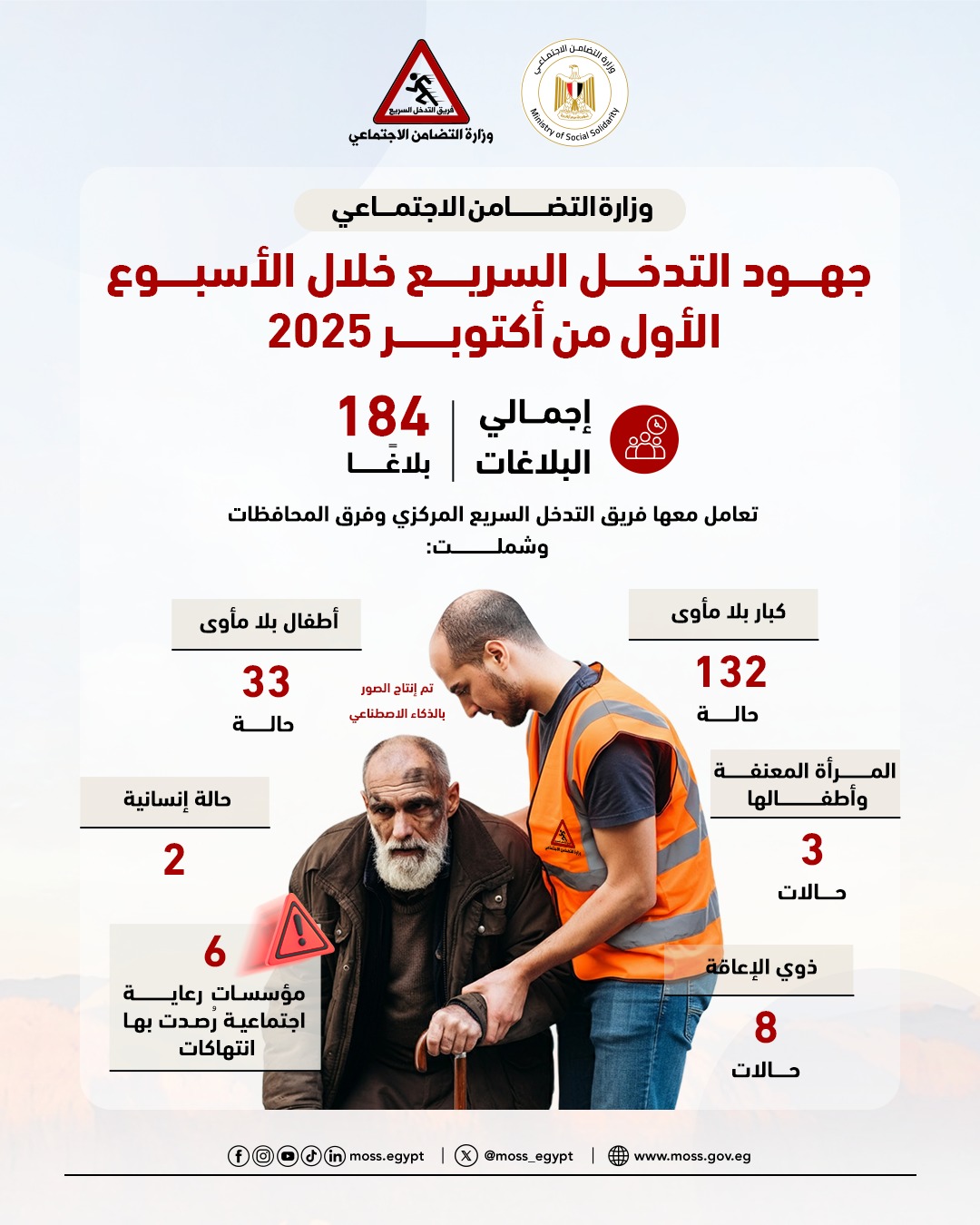 وقد بلغ عدد البلاغات التي تعامل معها فريق التدخل السريع خلال الأسبوع الأول من شهر أكتوبر الجاري نحو 184 بلاغًا متنوعًا، موزعة كالتالي “132 حالة كبار بلا مأوى ، 33 حالة أطفال بلا مأوى ، 3 حالات للمرأة المعنفة وأطفالها بدون مأوى، 2 حالة إنسانية، 8 حالات لذوي الإعاقة، و6 مؤسسات رعاية اجتماعية رُصدت بها انتهاكات” .