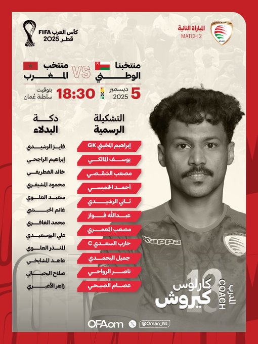 تشكيل منتخب عمان الرسمي ضد المغرب في كأس العرب 2025