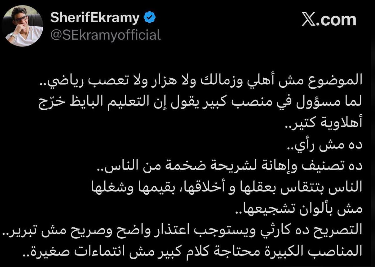 تحيا مصر، وكتب شريف إكرامي عبر حسابه الرسمي”أكس”:” الموضوع مش أهلي وزمالك ولا هزار ولا تعصب رياضي، لما مسؤول في منصب كبير يقول إن التعليم البايظ خرّج أهلاوية كتير دش مش رأي”.