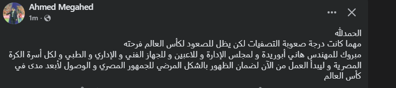 تحيا مصر، وكتب أحمد مجاهد عبر حسابه الرسمي”فيس بوك”: الحمدلله مهما كانت درجة صعوبة التصفيات لكن يظل للصعود لكأس العالم فرحته”.