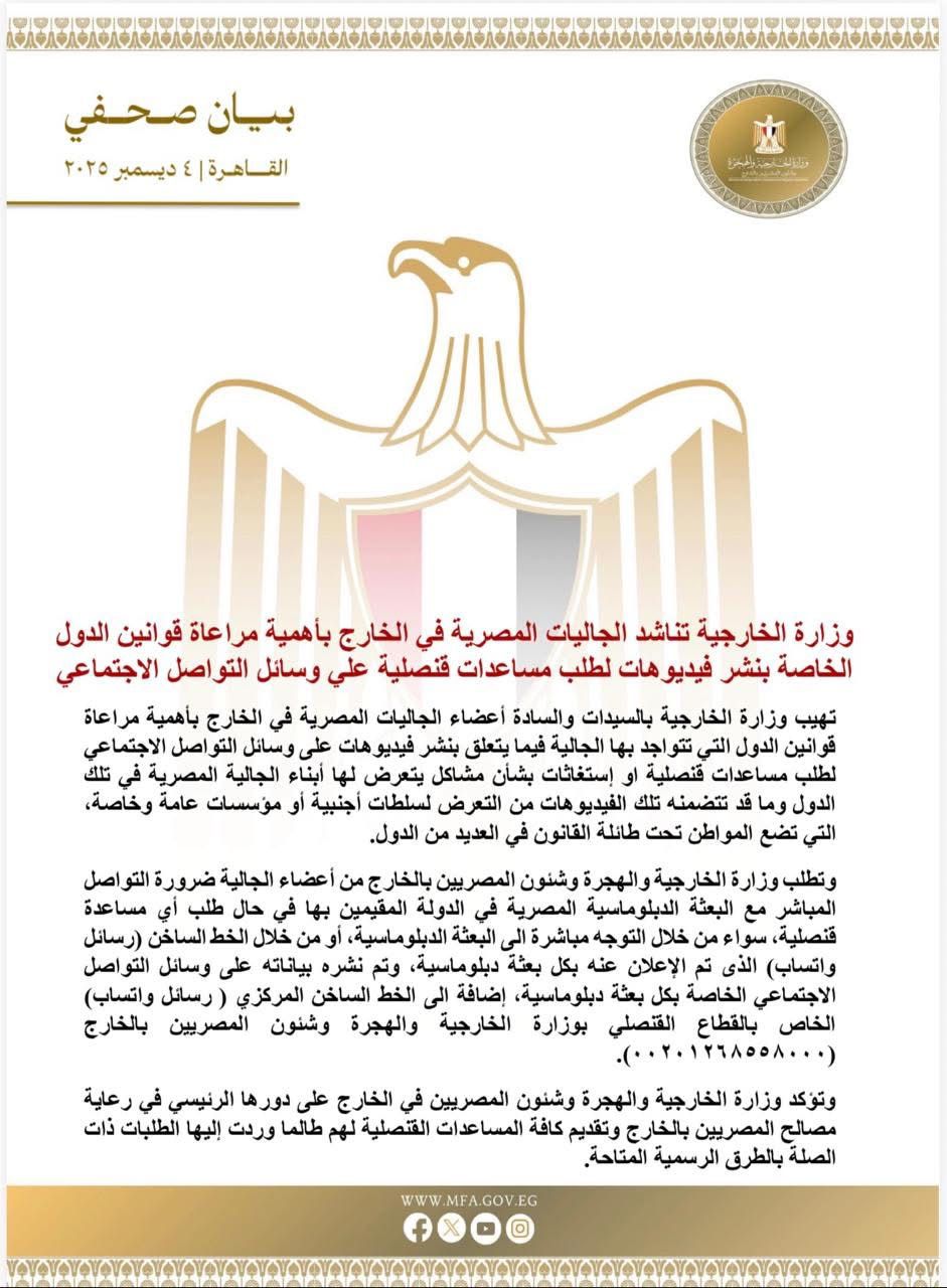 تهيب وزارة الخارجية بالسيدات والسادة أعضاء الجاليات المصرية في الخارج بأهمية مراعاة قوانين الدول التي تتواجد بها الجالية فيما يتعلق بنشر فيديوهات على وسائل التواصل الاجتماعي لطلب مساعدات قنصلية أو استغاثات بشأن مشاكل يتعرض لها أبناء الجالية المصرية في تلك الدول وقد تضمنت تلك الفيديوهات من التعرض لسلطات أجنبية أو مؤسسات عامة وخاصة، التي تضع المواطن تحت طائلة القانون في العديد من الدول.