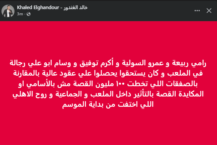 تحيا مصر، وكتب خالد الغندور عبر حسابه الرسمي”فيس بوك”: رامي ربيعة و عمرو السولية، و أكرم توفيق و وسام أبو علي رجالة في الملعب، وكان يستحقوا يحصلوا علي عقود عالية بالمقارنة بالصفقات اللي تخطت ١٠٠ مليون القصة مش بالأسامي، أو المكايدة القصة بالتأثير داخل الملعب و الجماعية و روح الاهلي اللي اختفت من بداية الموسم”.