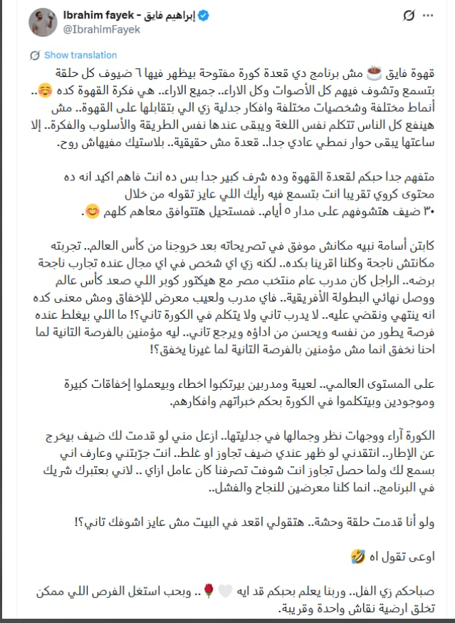 قدم الإعلامي إبراهيم فايق بياناً مطولاً دافع فيه عن فلسفة برنامجه “قهوة فايق”، مؤكداً أنه مساحة حرة لجميع الآراء الكروية المختلفة والمتباينة، تماماً كجلسات القهوة الحقيقية.
