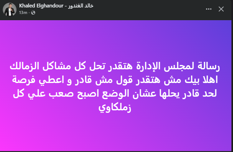تحيا مصر، وكتب خالد الغندور عبر حسابه الرسمي “فيس بوك”: رسالة لمجلس الإدارة هتقدر تحل كل مشاكل الزمالك اهلاً، بيك مش هتقدر قول مش قادر واعطي فرصة لحد قادر يحلها عشان الوضع أصبح صعب علي كل زملكاوي “.