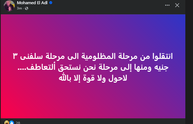 تحيا مصر،  وكتب محمد العدل عبر حسابه الرسمي”فيس بوك”: انتقلوا من مرحلة المظلومية الى مرحلة سلفنى ٣ جنيه ومنها إلى مرحلة نحن نستحق ألتعاطف لاحول ولا قوة إلا بالله”.
