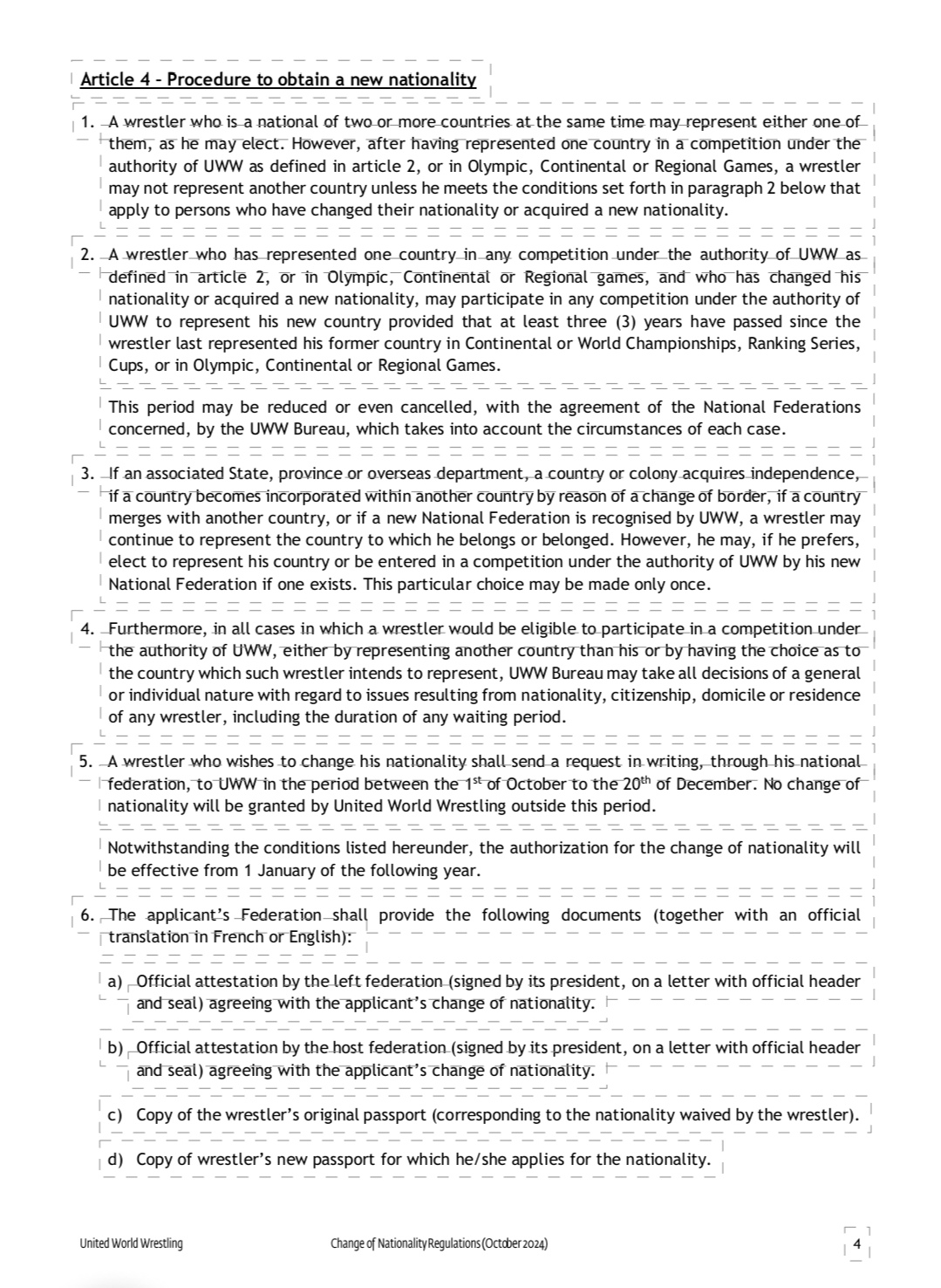 – الحد الأقصى للتجنيس: يسمح الاتحاد الدولي لكل دولة بتجنيس لاعب واحد فقط في كل فرع من فروع المصارعة (الرومانية – الحرة – النسائية)، وبحد أقصى ثلاثة لاعبين في المجمل.
