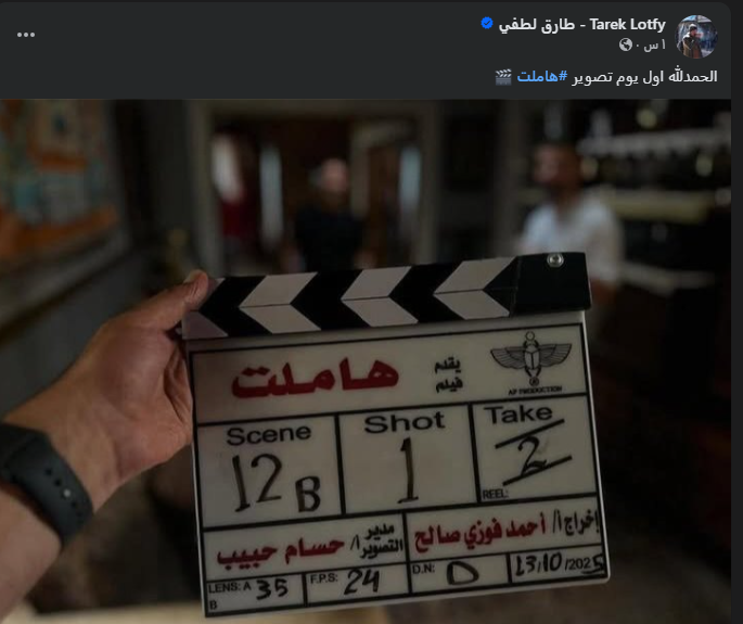 وشارك الفنان طارق طارق لطفي، صورة لكلاكيت العمل، وفقا لما رصده موقع تحيا مصر، عبر صفحته الرسمية على موقع التواصل الاجتماعي فيسبوك وعلق عليه: الحمدلله اول يوم تصوير هاملت.