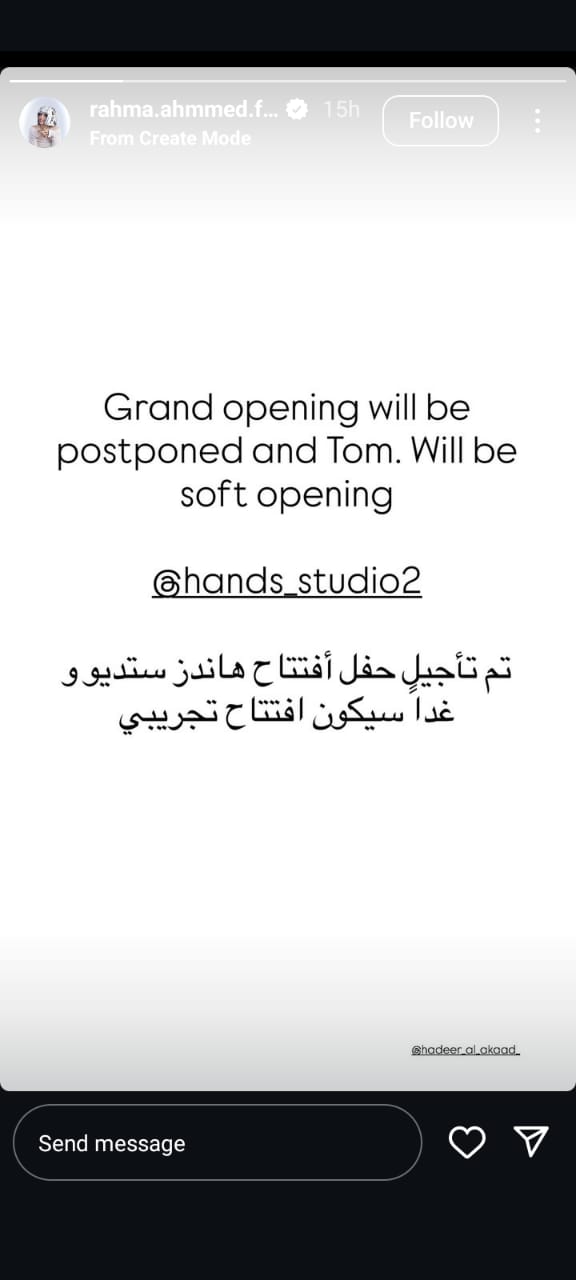 أعلنت الفنانة رحمة أحمد فرج تأجيل افتتاح مشروعها الجديد هاندز ستوديو، والذي كان من المقرر تدشينه رسميًا مساء الثلاثاء 23 سبتمبر في القاهرة الجديدة، ونرصد تفاصيل تأجيل افتتاح مشروعها الجديد.
