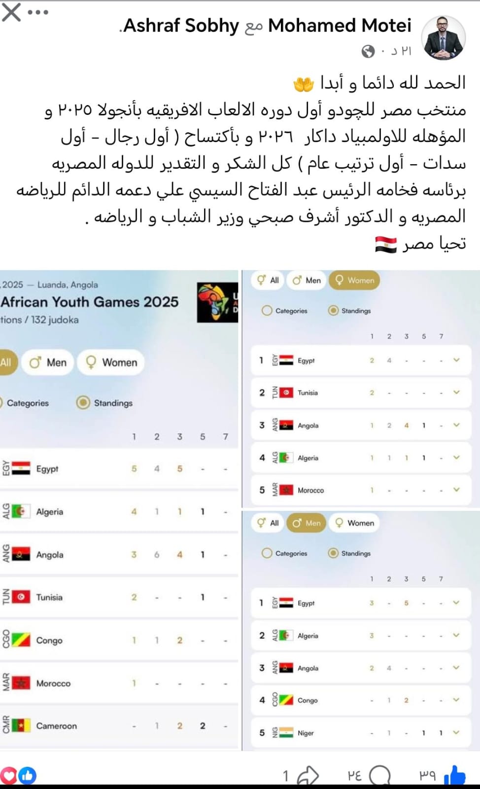 وقال محمد مطيع في رسالته: «الحمد لله دائمًا وأبدًا، منتخب مصر للجودو أول دورة الألعاب الأفريقية بأنجولا 2025 والمؤهلة لأولمبياد داكار 2026، وباكتساح (أول رجال، أول سيدات، أول ترتيب عام)، كل الشكر والتقدير للدولة المصرية برئاسة فخامة الرئيس عبد الفتاح السيسي رئيس الجمهورية على دعمه الدائم للرياضة المصرية، والدكتور أشرف صبحي وزير الشباب والرياضة».