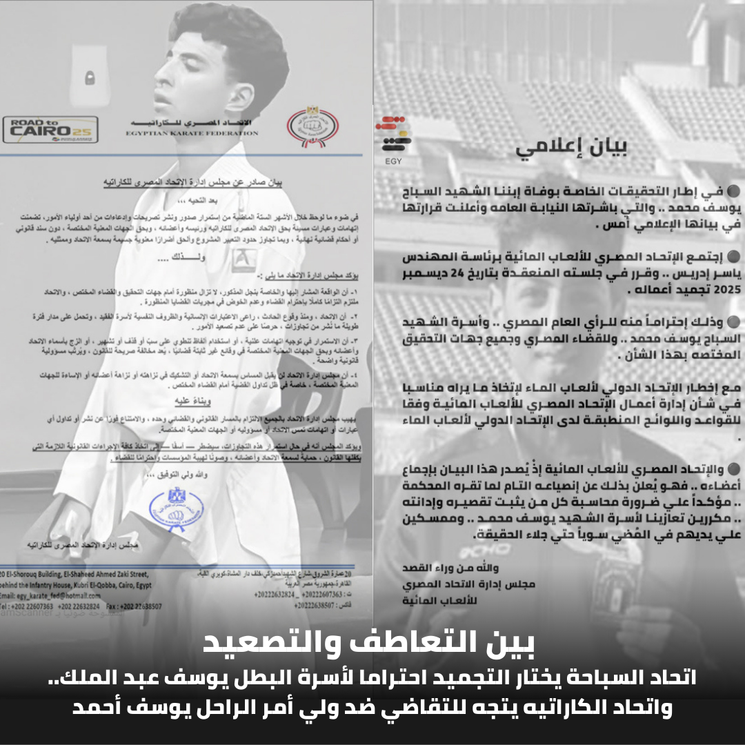 ففي سابقة تعد الأولى من نوعها، أعلن الاتحاد المصري للألعاب المائية «اتحاد السباحة» تجميد أعمال مجلس إدارته بشكل كامل، وذلك في ضوء التحقيقات الجارية بشأن واقعة وفاة السباح الراحل يوسف محمد عبد الملك، وبعد البيان الصادر عن النيابة العامة بشأن القضية.