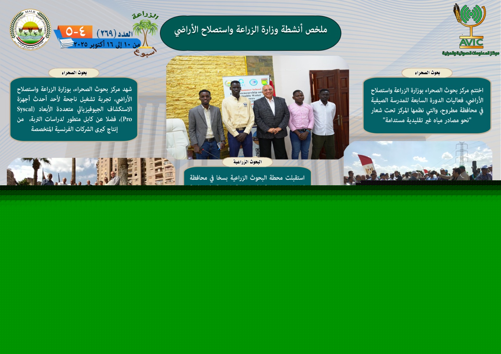 فيما أعلنت وزارة الزراعة واستصلاح الأراضي، ختام أعمال المنتدى رفيع المستوى حول تحقيق الاكتفاء الذاتي من الأرز في إفريقيا، والذي عُقد بالقاهرة، كما اختتم مركز بحوث الصحراء بوزارة الزراعة واستصلاح الأراضي، فعاليات الدورة السابعة للمدرسة الصيفية في محافظة مطروح، والتي نظمها المركز تحت شعار “نحو مصادر مياه غير تقليدية مستدامة”، كذلك شهد المركز، تجربة تشغيل ناجحة لأحد أحدث أجهزة الاستكشاف الجيوفيزيائي متعددة الأبعاد (Syscal Pro)، فضلا عن كابل متطور لدراسات التربة، من إنتاج كبرى الشركات الفرنسية المتخصصة.