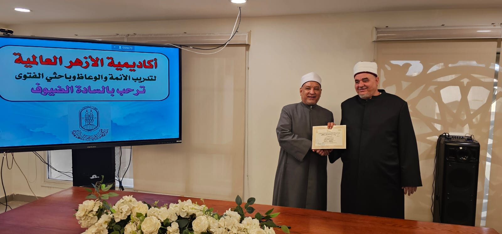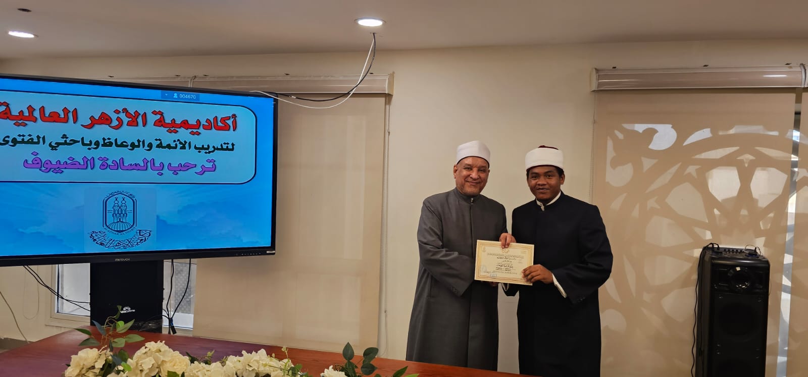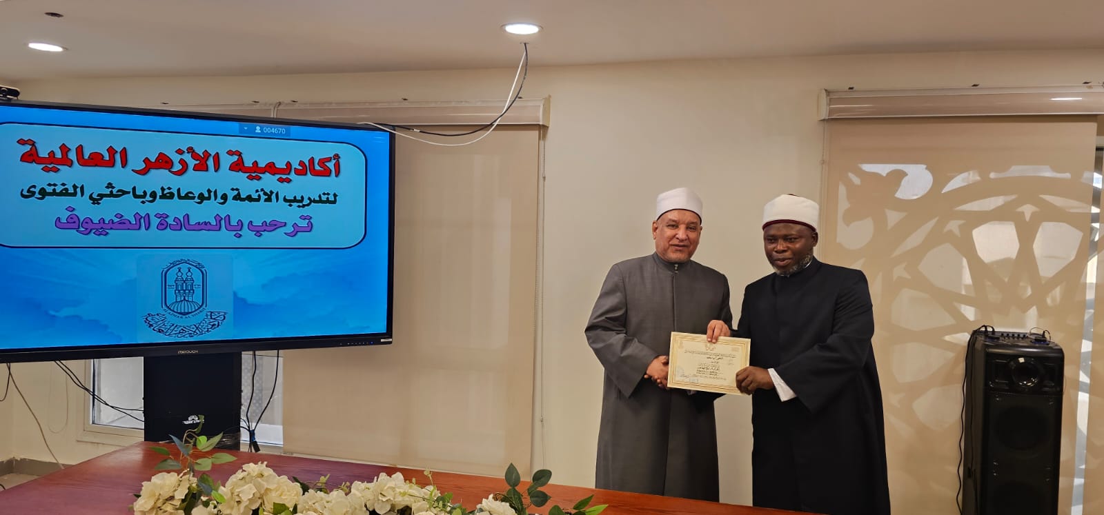 وفي ختام الاحتفال، قام الدكتور/ حسن الصغير، بتسليم الشهادات إلى المشاركين، موجهًا لهم التحية على التزامهم وجديّتهم، ومتمنيًا لهم دوام التوفيق والسداد في أداء رسالتهم الدعوية، وأن يكونوا قدوة في ترسيخ الصورة المشرقة للإسلام وقيمه السمحة في مجتمعاتهم.