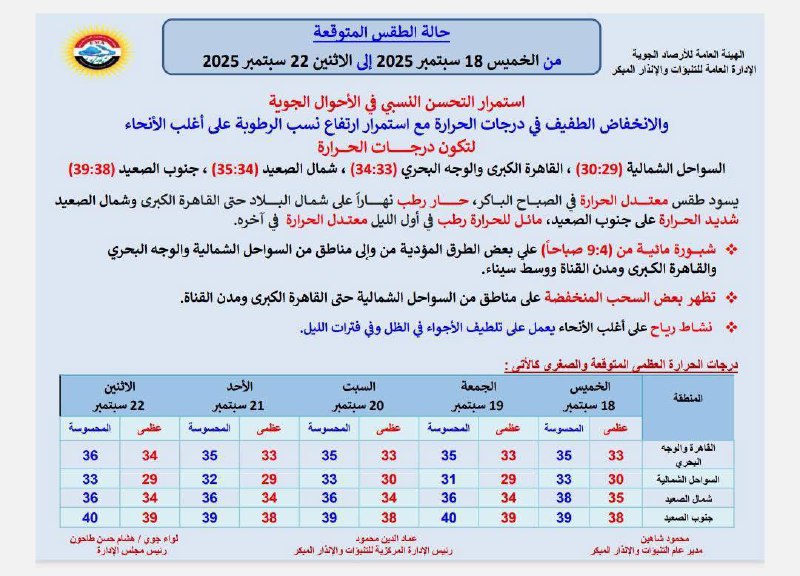 من المتوقع أن تتراوح درجات الحرارة على القاهرة الكبرى والوجه البحري ما بين (29 : 30) للعظمى، بينما تسجل السواحل الشمالية درجات حرارة تتراوح ما بين (28 : 30)، أما شمال الصعيد فتتراوح بين (34 : 35)، فيما تصل بجنوب الصعيد إلى (38 : 39) درجة مئوية.