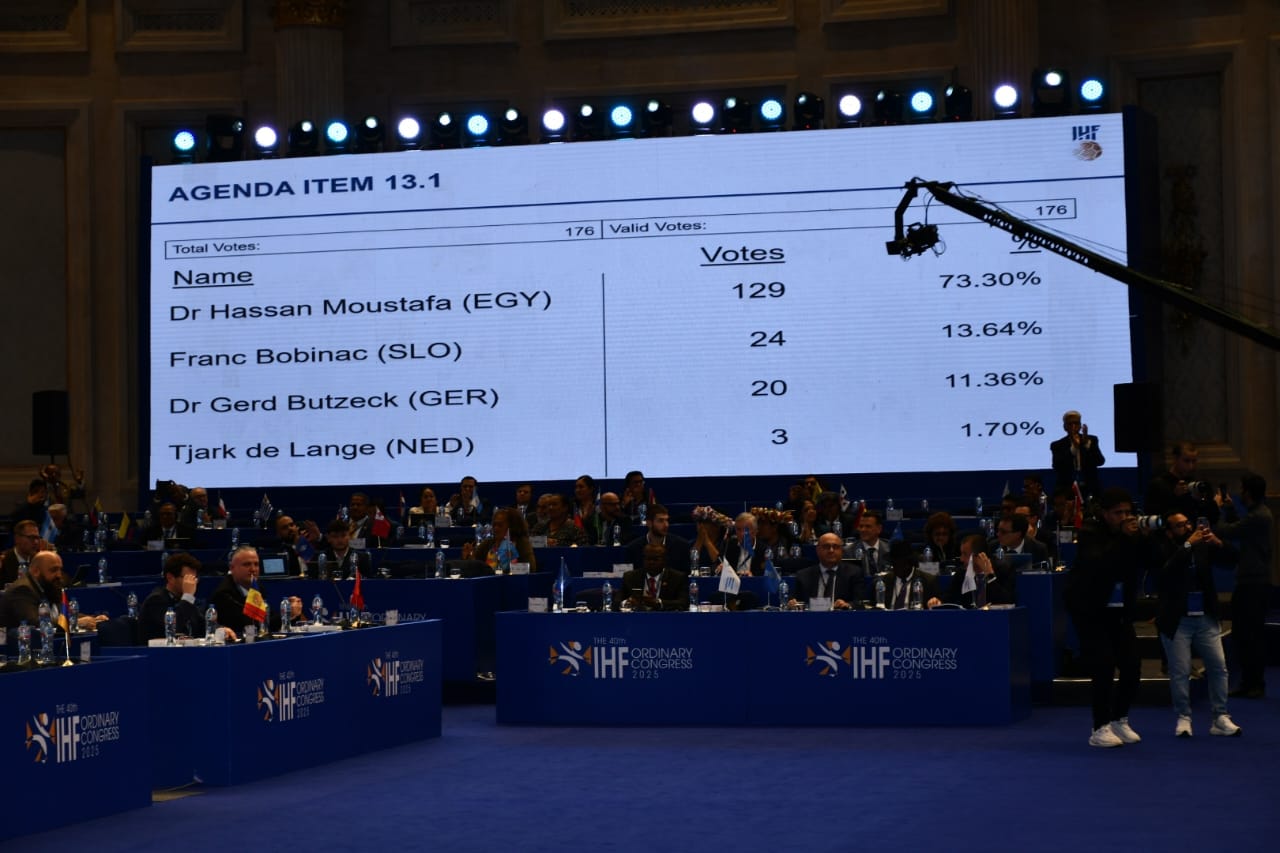 حسم الدكتور حسن مصطفى، رئيس الاتحاد الدولي لكرة اليد، سباق رئاسة الاتحاد الدولي بعد حصوله على 129 صوتا من إجمالي أصوات الجمعية العمومية، متفوقا على منافسيه الثلاثة، حيث حصل فرانك بوبيناك مرشح سلوفينيا على 24 صوتا، وجيرد بوتزيك مرشح ألمانيا على 20 صوتا، بينما نال تجارك دي لانج مرشح هولندا 3 أصوات، ليحصد حسن مصطفى الأغلبية المطلوبة ويواصل قيادته للعبة عالميا، ويستعرض تحيا مصر التفاصيل.