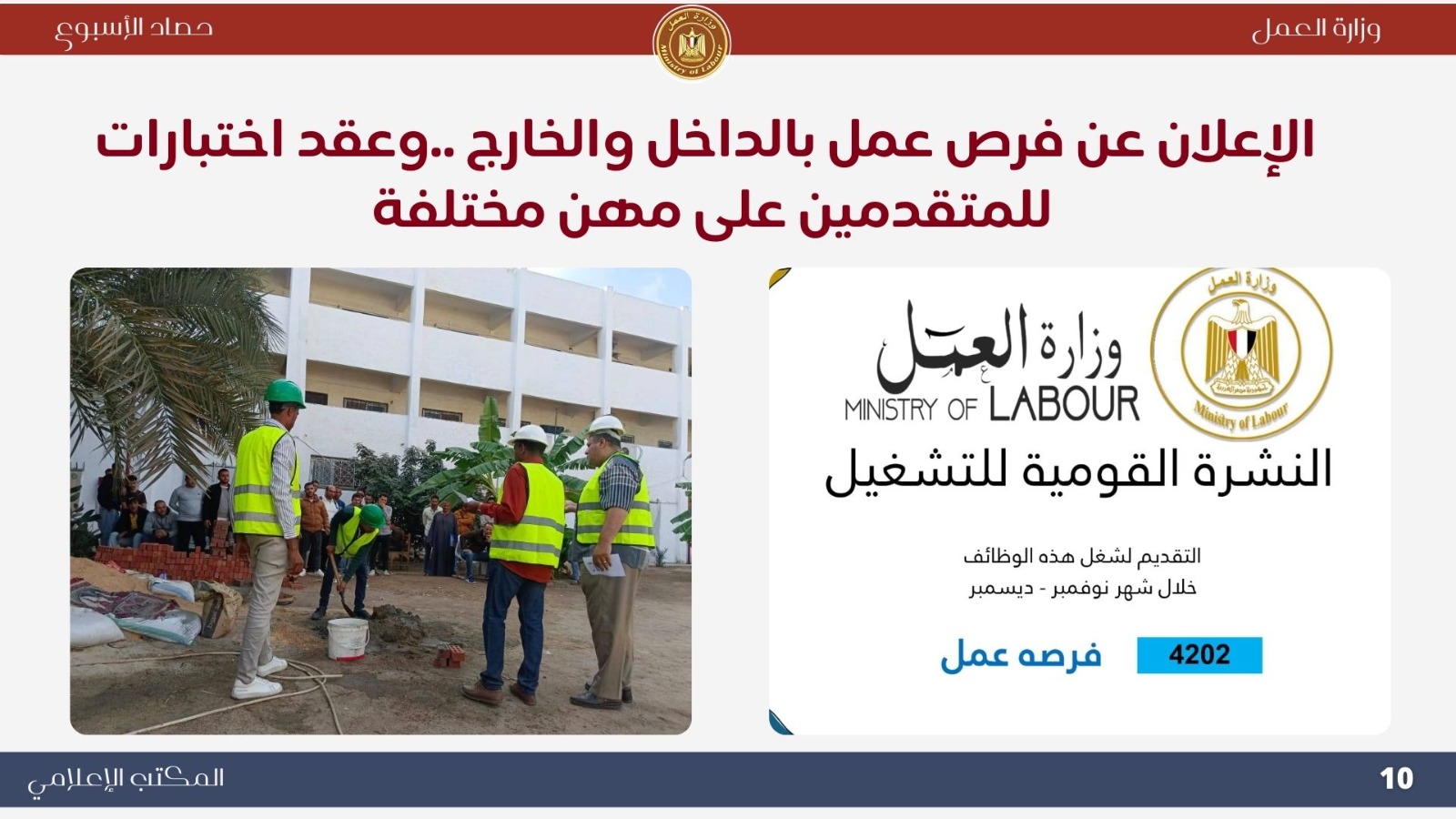 أعلنت وزارة العمل من خلال انفوجراف عن حصاد أبرز أنشطتها خلال الأسبوع الجاري ،وهذا في إطار تنفيذ توجيهات القيادة السياسية، واستمرار جهود وزارة العمل لتعزيز بيئة العمل وحماية حقوق العمال، والتي شملت مشاركات دولية، واجتماعات ثنائية، وجهود تفتيش ميدانية، ودعم العمالة المصرية بالخارج، وتوفير فرص عمل للشباب، وذلك على النحو التالي: