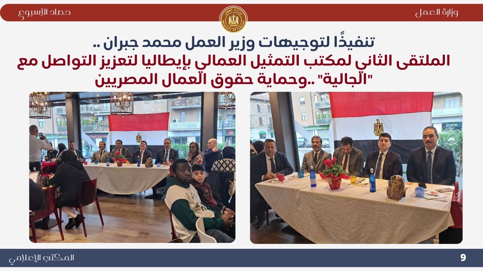 كما نظم مكتب التمثيل العمالي في إيطاليا ملتقى موسعًا للجالية المصرية، لتعريفهم بحقوقهم وآليات الدعم، وتعزيز سبل الاستفادة من نظم التأمين والمعاشات الإيطالية.