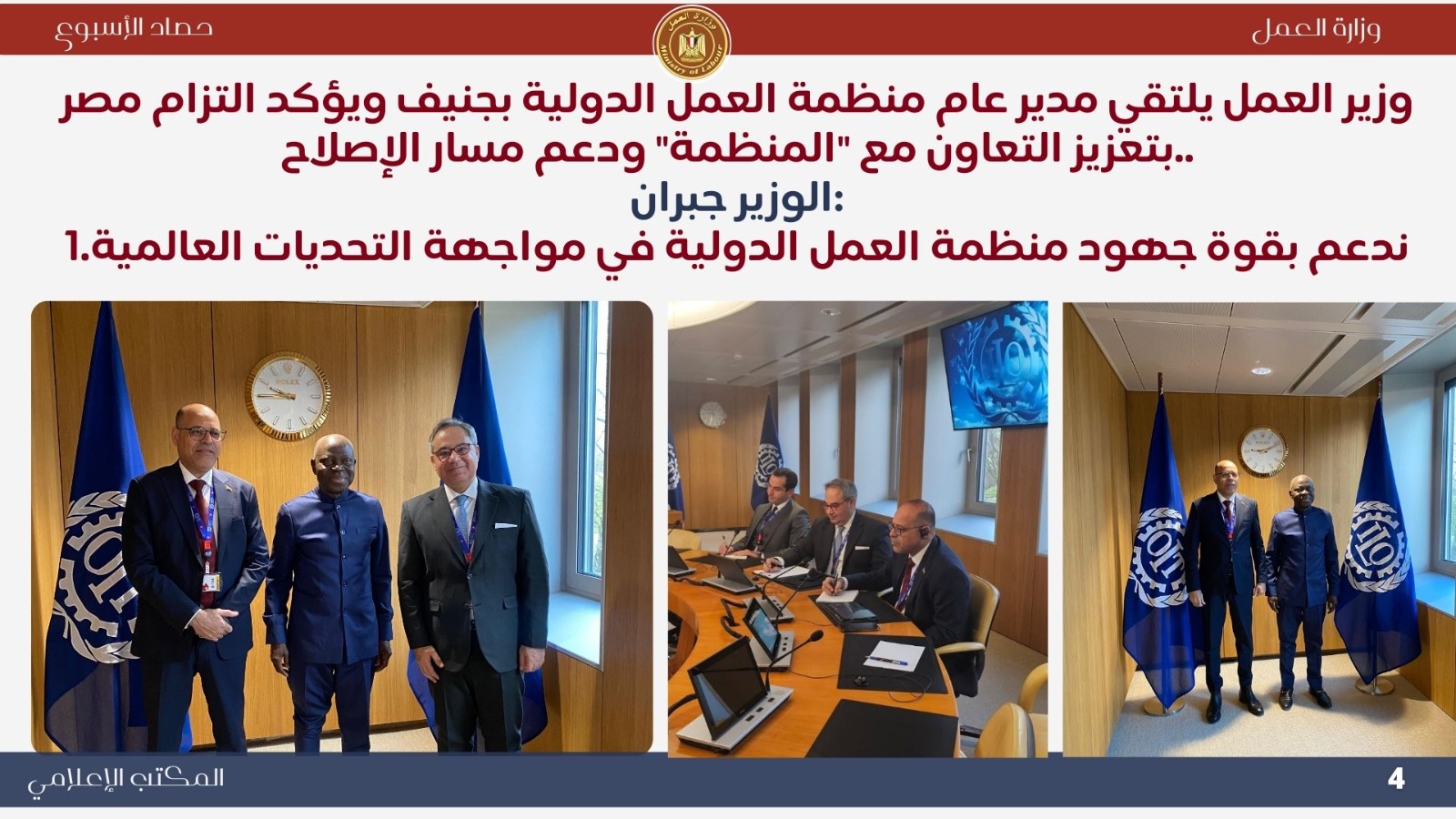 جدير بالذكر قد شارك وزير العمل محمد جبران في أعمال الدورة (355) لمجلس إدارة منظمة العمل الدولية بمدينة جنيف، حيث ناقشت الاجتماعات ملفات مستقبل العمل، والعدالة الاجتماعية، والانتقال إلى العمل المنظم، والمعايير الدولية، بما يعكس حرص مصر على دعم الحوار الاجتماعي وتعزيز بيئة العمل اللائق.
