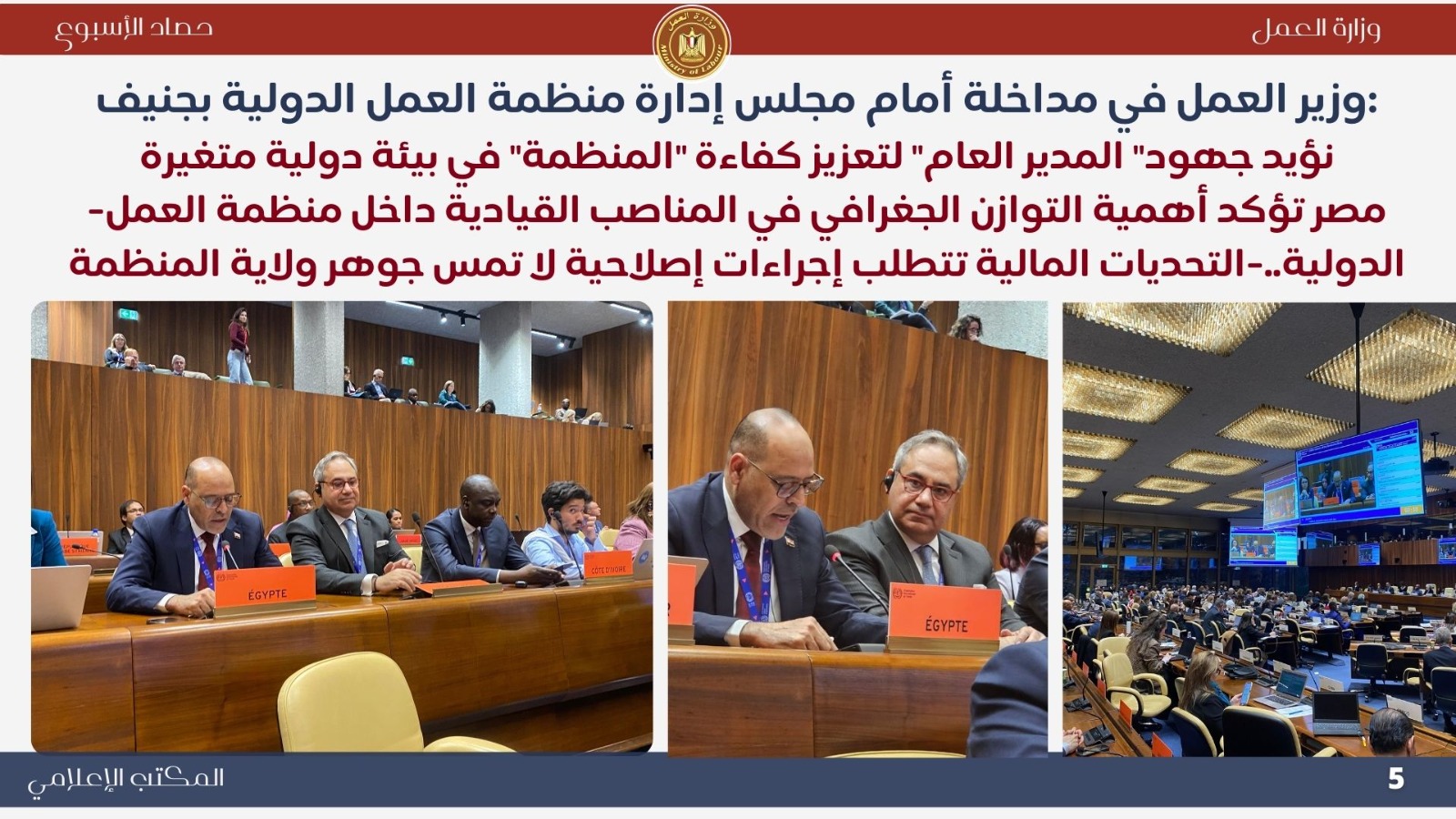 وفي هذا السياق أكد الوزير في مداخلته دعم مصر لمسار إصلاح المنظمة، وأهمية التوازن الجغرافي في المناصب القيادية، وتعزيز القدرات الإقليمية، والحفاظ على الطبيعة الثلاثية للمنظمة.