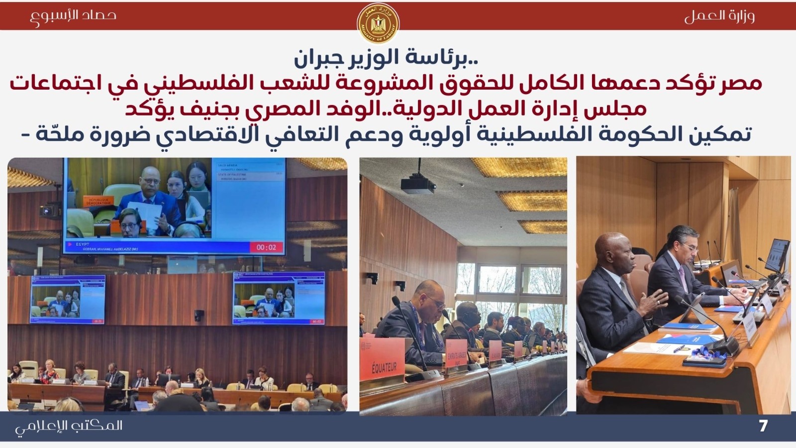 كما ترأس وزير العمل بصفته رئيس مجلس إدارة منظمة العمل العربية – اجتماع المجموعة العربية، مؤكدًا أهمية التكامل العربي والتنسيق المشترك، ودعم القضايا العمالية العربية، وعلى رأسها دعم العمالة الفلسطينية وتعزيز التعاون العربي الدولي.