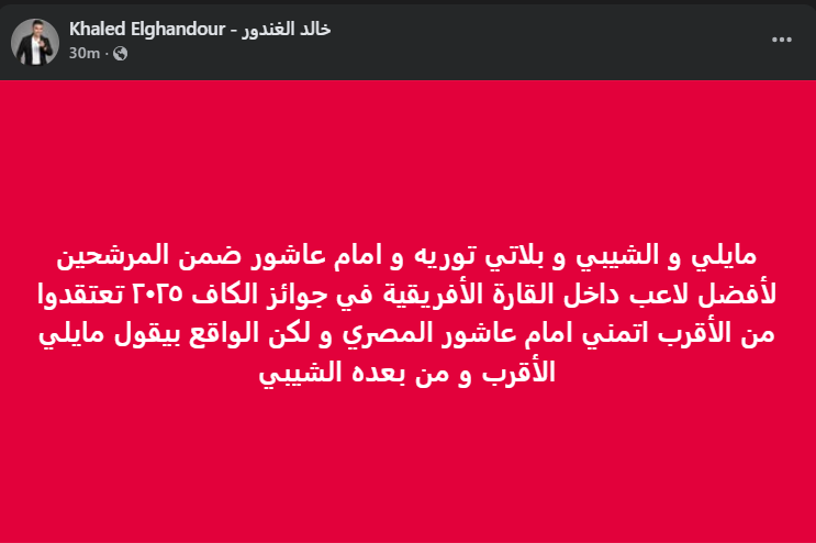 تحيا مصر، وكتب خالد الغندور عبر حسابه الرسمي”فيس بوك”: مايلي و محمد الشيبي و بلاتي توريه، و إمام عاشور ضمن المرشحين لأفضل لاعب داخل القارة الأفريقية في جوائز الكاف ٢٠٢٥ “.