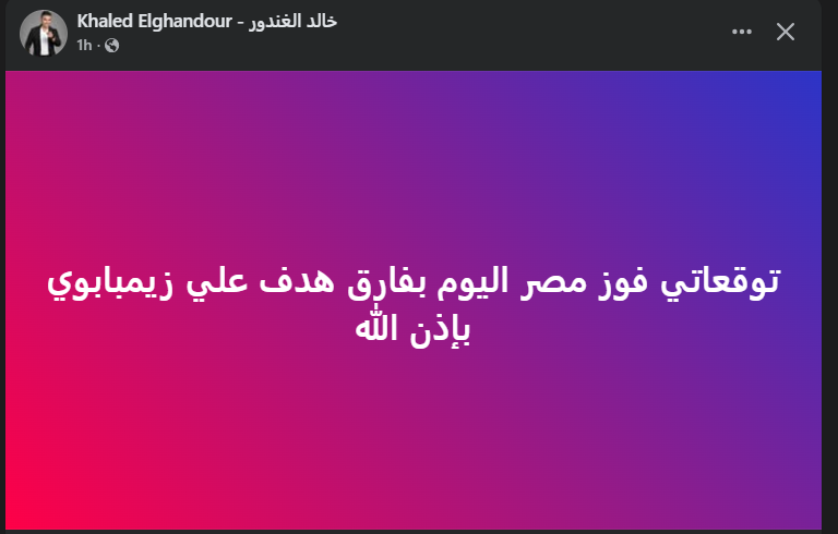 تحيا مصر،ونشر الغندور توقعه عبر حسابه الرسمي على “فيس بوك” قائلاً: “توقعاتي فوز مصر اليوم بفارق هدف علي زيمبابوي بإذن الله”.
