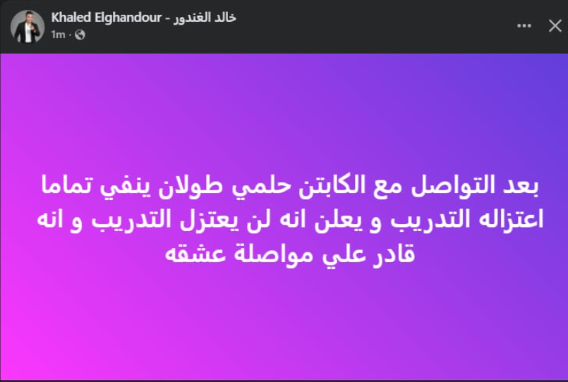 تحيا مصر، وكتب خالد الغندور عبر حسابه الرسمي”فيس بوك”: بعد التواصل مع الكابتن حلمي طولان ينفي تماما اعتزاله التدريب، ويعلن إنه لن يعتزل التدريب و إنه قادر علي مواصلة عشقه”.