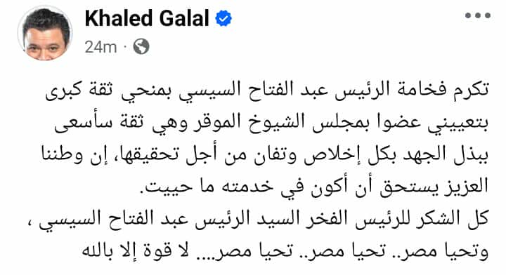 منشور خالد جلال بعد تعيينه عضوا بمجلس الشيوخ