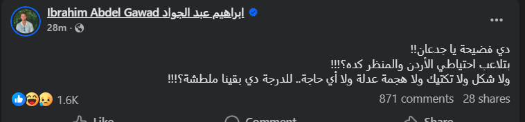 تحيا مصر، وكتب إبراهيم عبد الجواد عبر حسابه الرسمي”فيس بوك”: دي فضيحة يا جدعان، بتلاعب احتياطي الأردن والمنظر كده”.