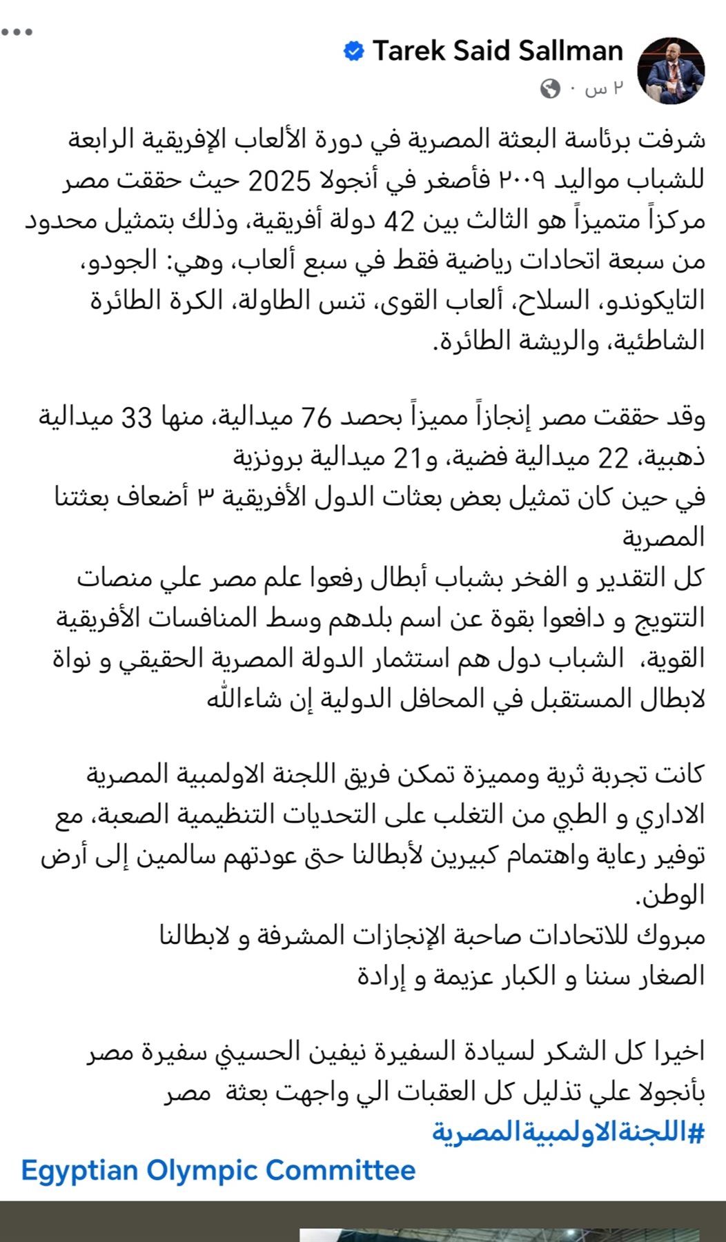 نشر طارق السعيد، رئيس البعثة المصرية في دورة الألعاب الأفريقية الرابعة للشباب المقامة في أنجولا 2025، وعضو اللجنة الأولمبية المصرية ونائب رئيس الاتحاد المصري لكرة السلة، عبر صفحته الرسمية على موقع فيس بوك، رسالة أكد خلالها فخره بالإنجاز الذي حققته البعثة المصرية خلال مشاركتها في الدورة، ويستعرض تحيا مصر التفاصيل.