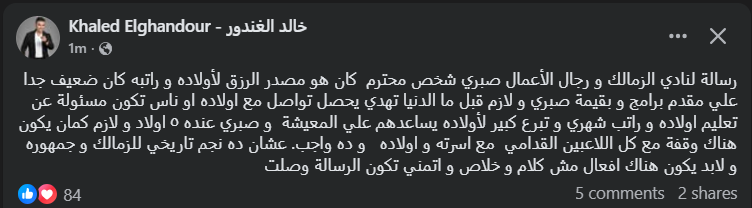 تحيا مصر، وكتب خالد الغندور عبر حسابه الرسمي”فيس بوك”: رسالة لنادي الزمالك، ورجال الأعمال صبري شخص محترم كان هو مصدر الرزق لأولاده، و راتبه كان ضعيف جدا علي مقدم برامج و بقيمة صبري”.
