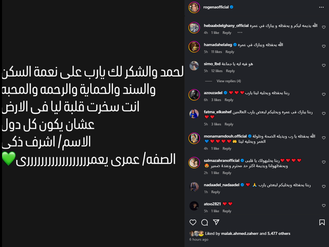 وكتبت الفنانة روجينا، رسالة خاصة لزوجها الفنان أشرف زكي، تعبر فيها حبها وامتنانها الشديد، وفقا لما رصده موقع تحيا مصر، صفحتها الرسمية على موقع التواصل الاجتماعي إنستجرام، قالت فيه: الحمد والشكر لك يارب على نعمة السكن والسند والحماية والأمان والرحمة والمحبة.. أنت سخرت قلبه ليا في الأرض عشان يكونوا كل دول.