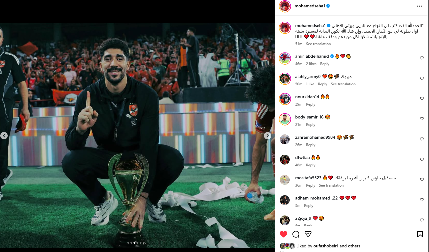 تحيا مصر، وكتب محمد سيحا عبر حسابه الرسمي”انستجرام”: الحمدلله الذي كتب لي النجاح مع ناديي وبيتي الأهلي اول بطولة لي مع الكيان الحبيب، وإن شاء الله تكون البداية لمسيرة مليئة بالإنجازات شكرًا لكل من دعم ووقف خلفناً”.