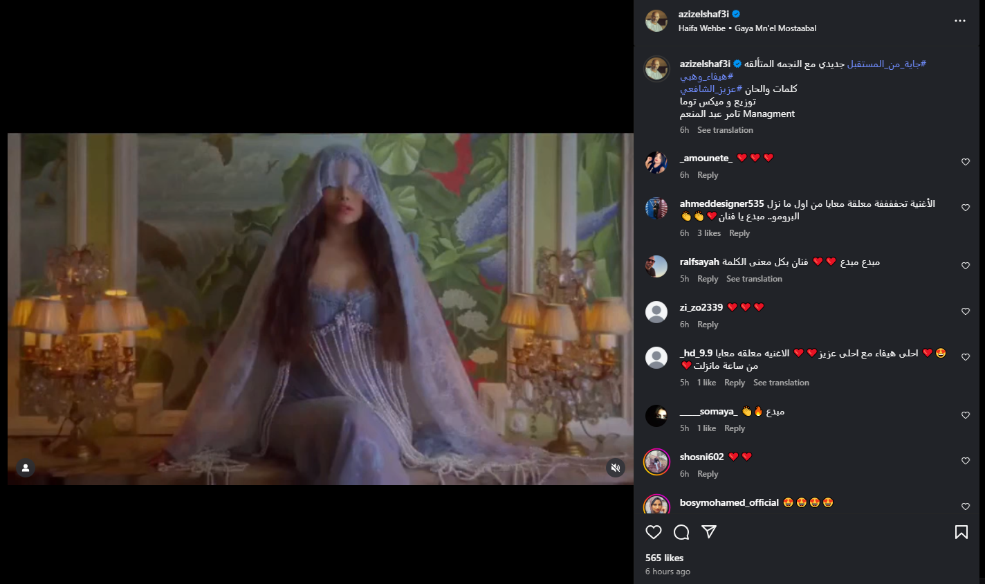 وشارك الملحن عزيز الشافعي، برومو من أغنية جاية من المستقبل، للفنانة هيفاء وهبي، وفقا لما رصده موقع تحيا مصر، عبر صفحته الرسمية على موقع التواصل الاجتماعي إنستجرام: جاية من المستقبل جديدي مع النجمة المتألقة هيفاء وهبي، كلمات وألحان عزيز الشافعي، توزيع وميكس توما.