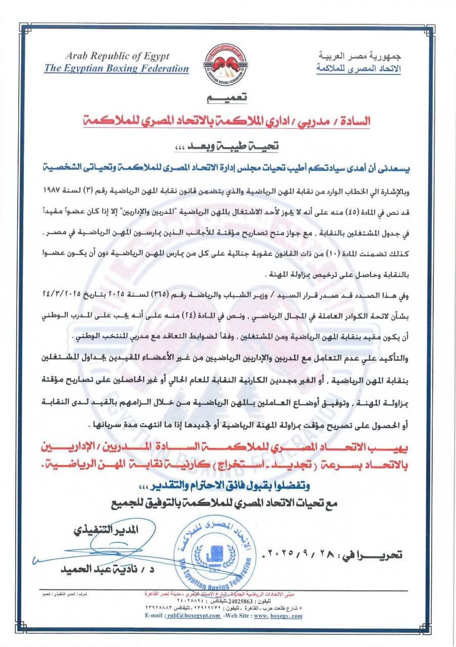 وفي هذا الإطار، أصدر الاتحاد المصري للملاكمة تعميمًا رسميًا إلى جميع المدربين والإداريين العاملين بالاتحاد، أكد فيه التزامه التام بما ورد في خطاب نقابة المهن الرياضية، مشددًا على ضرورة الإسراع في تجديد أو استخراج كارنية نقابة المهن الرياضية لكل من يزاول العمل الفني أو الإداري بالاتحاد.