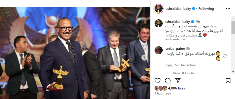 وشارك الفنان أشرف عبد الباقي، صورة من تكريمه من مهرجان همسة الدولي للآداب، عن دوره في مسلسل قلبي ومفتاحه، وفقا لما رصده موقع تحيا مصر، عبر صفحته الرسمية على موقع التواصل الاجتماعي إنستجرام وعلق عليها: بشكر مهرجان همسة الدولي للآداب والفنون على تكريمه ليا عن دور شناوي من مسلسل قلبي ومفتاحه.