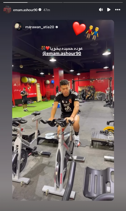 تحيا مصر، ونشر مروان عطية لاعب النادي الاهلي، صورة لإمام عاشور داخل صلات الجيم عبر حسابه الرسمي”إنستجرام”، معلقاً:” عودة حميدة يا أخويا”.
