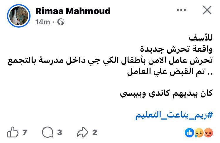 تعرض 5 طلاب فى كي جي بأحد المدارس الخاصة بمنطقة التجمع لواقعة تحرش على يد عامل بالأمن .