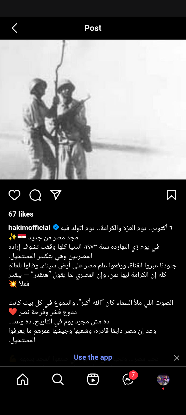وكتب حكيم في منشور رصده موقع تحيا مصر على حسابه الرسمي بموقع تبادل الصور والفيديوهات انستجرام: ٦ أكتوبر.. يوم العزة والكرامة.. يوم اتولد فيه مجد مصر من جديد، في يوم زي النهارده سنة ١٩٧٣، الدنيا كلها وقفت تشوف إرادة المصريين وهي بتكسر المستحيل، جنودنا عبروا القناة، ورفعوا علم مصر على أرض سيناء، وقالوا للعالم كله إن الكرامة ليها تمن، وإن المصري لما يقول “هنقدر” — بيقدر فعلاً.