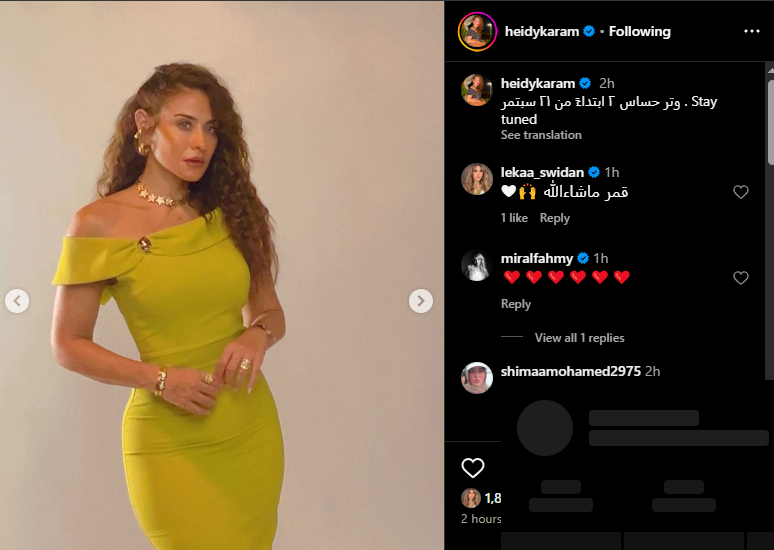 وشاركت الفنانة هيدي كرم، صورا من شخصيتها في مسلسل وتر حساس 2، وفقا لما رصده مموقع تحيا مصر، عبر صفحتها الرسمية على موقع التواصل الاجتماعي إنستجرام، وعلقت عليه: وتر حساس 2 ابتداء من 21 سبتمبر.