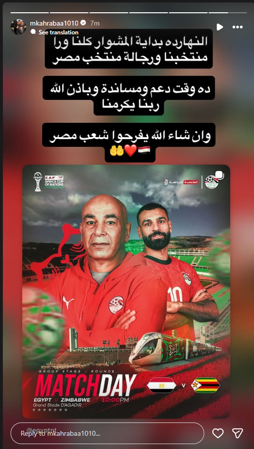 تحيا مصر، ونشر كهربا رسالة دعم على منصاته للتواصل الاجتماعي، قال فيها: “النهاردة بداية المشوار كلنا ورا منتخبنا، ورجالة منتخب مصر”، مضيفاً: “ده وقت دعم ومساندة وبإذن الله ربنا يكرمنا وإن شاء الله يفرحوا شعب مصر”.