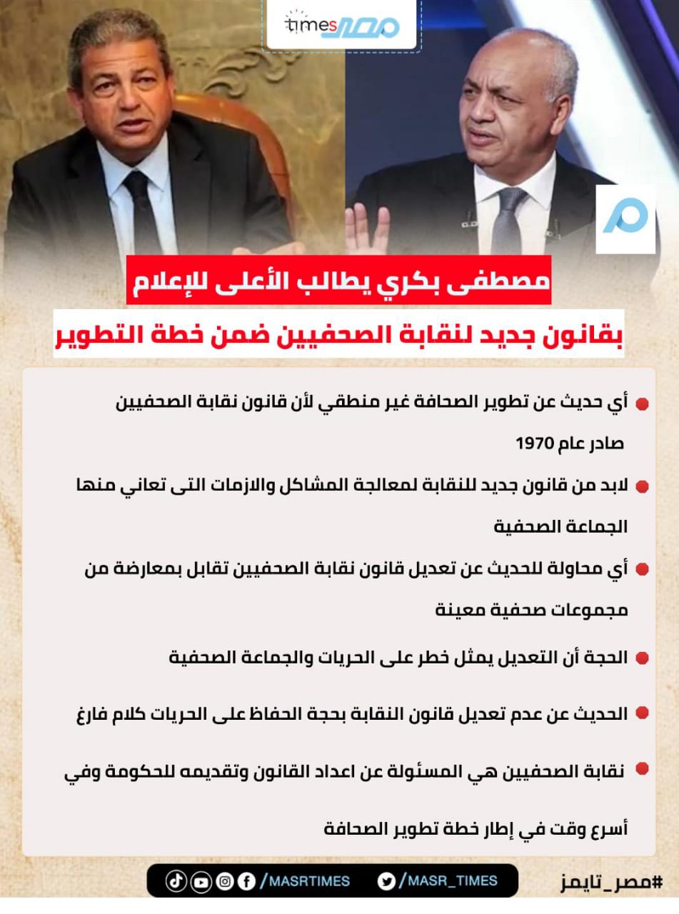 وأكد “بكري” في تصريحات خاصة لـ “مصر تايمز” أن الحديث عن عدم تعديل قانون النقابة بحجة الحفاظ على الحريات كلام فارغ، مؤكداً على أن نقابة الصحفيين هي المسئولة عن اعداد القانون وتقديمه للحكومة، وفي أسرع وقت في إطار خطة تطوير الصحافة.