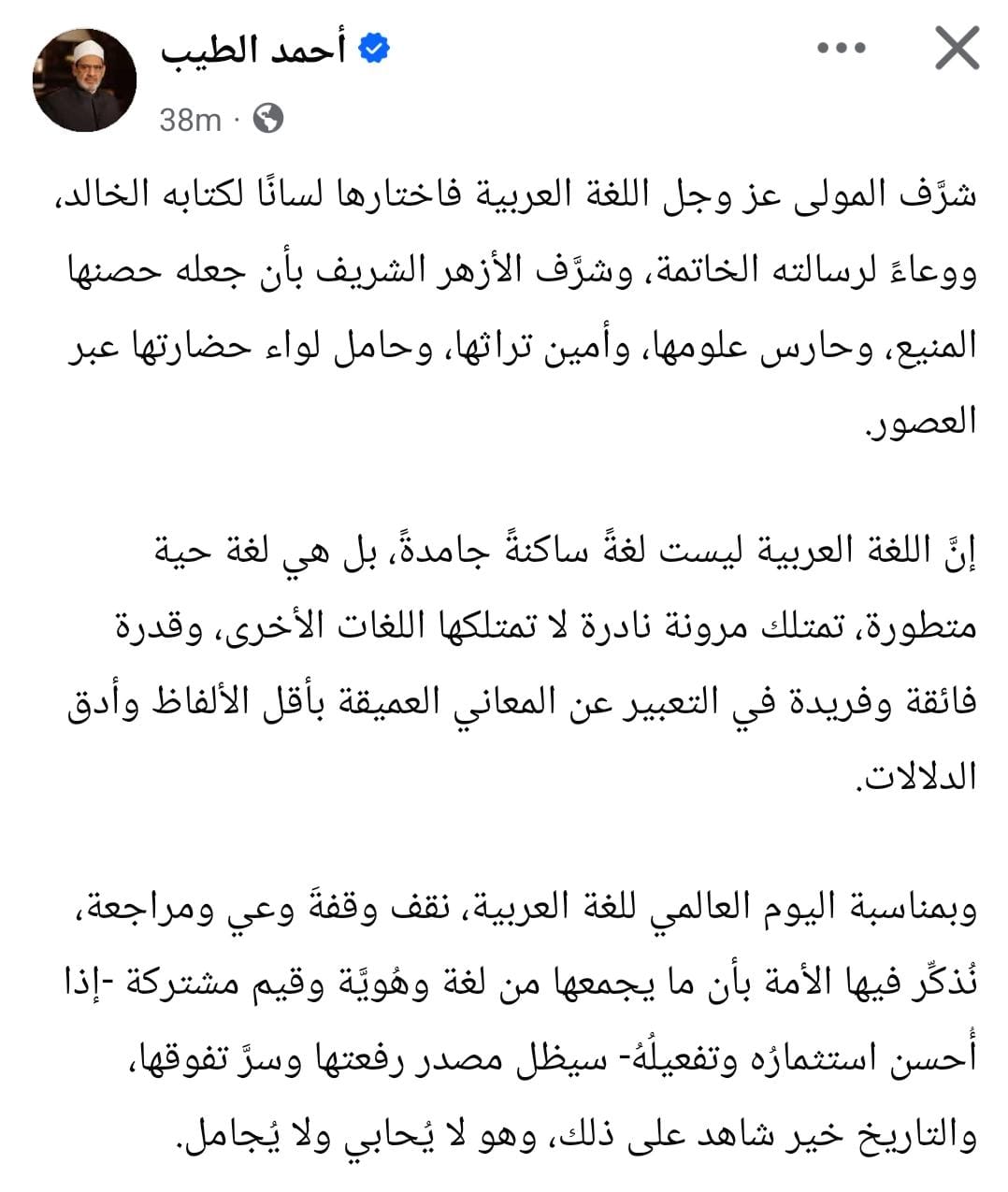وأوضح البيان أن المولى عز وجل قد شرّف الأزهر الشريف بأن جعله عبر العصور الحصن المنيع للغة العربية، والحارس الأمين على علومها وتراثها، وحامل لواء حضارتها التي أضاءت العالم لقرون طويلة.
